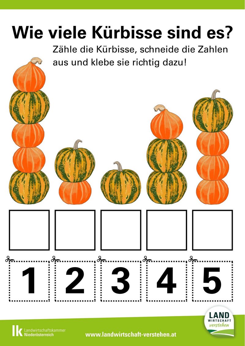 Na, bist du bereit für ein herbstliches Zahlen-Abenteuer? Schau dir die bunten Kürbisstapel ganz genau an – wie viele Kürbisse sind da wohl übereinander gestapelt? Zähle sie in Ruhe durch, dann schnapp dir eine Schere und schneide die Zahlen unten am Blatt entlang der Linie aus und klebe sie unter den richtigen Kürbisstapel. Viel Spaß beim Zählen, Schneiden und Kleben – und vergiss nicht: Jeder Kürbis zählt!