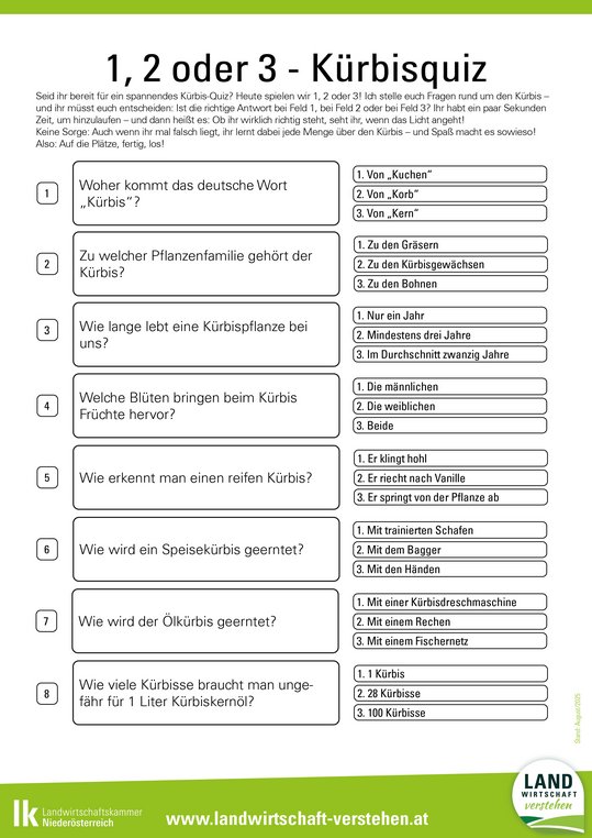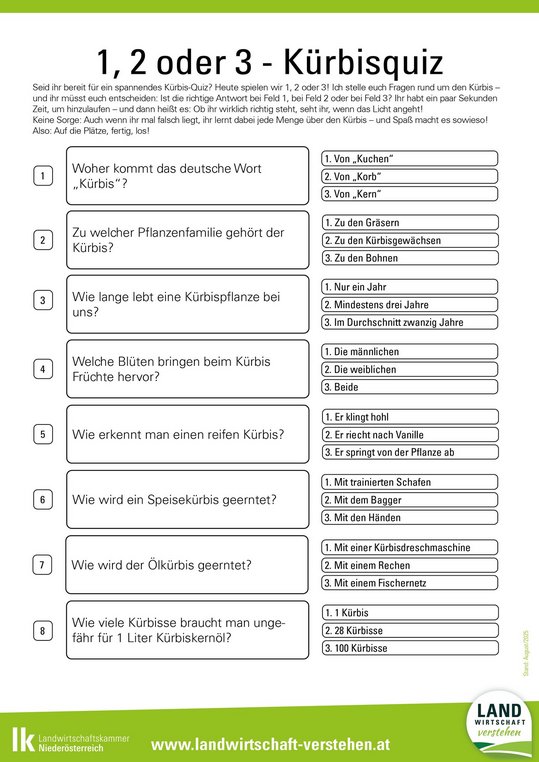 Lust auf ein spannendes Kürbis-Quiz? Im Stil von 1, 2 oder 3 gibt es 16 knifflige Rätselfragen rund um den Kürbis. Glaubst du, dass Antwort 1 richtig ist, dann stell ich dich zu dem Feld 1, für Fragen 2 zu dem Feld 2 und bei Frage 3 zu dem Feld 3.