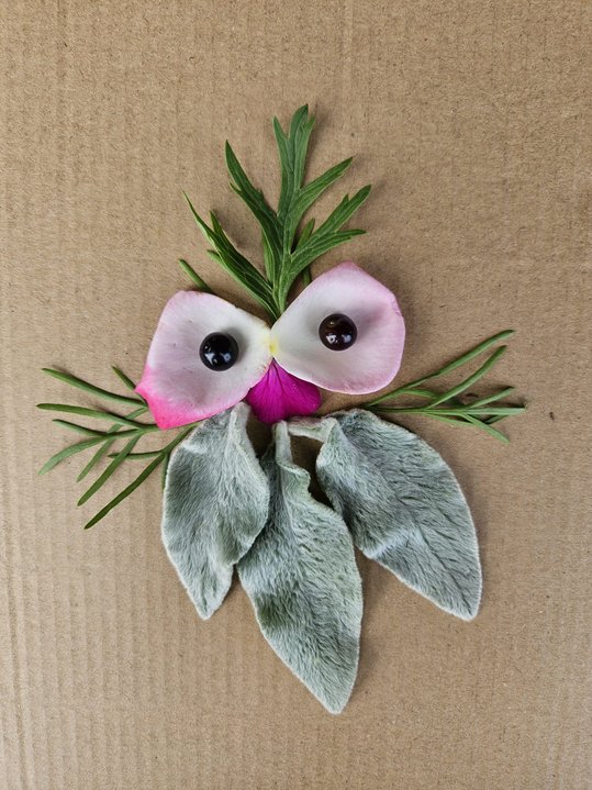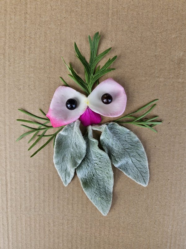 - Details hinzufügen: Du kannst Augen, Mund und andere Details mit kleinen Blüten oder mit Stiften und Farben hinzufügen.