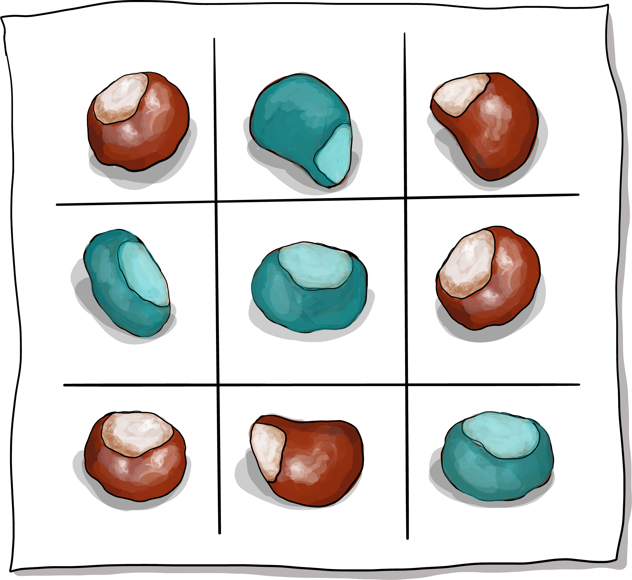 - Die Spieler:innen nehmen abwechselnd ihre Kastanien und legen sie auf die leeren Felder im Raster. Ziel ist es, drei eigene Kastanien in einer Reihe, Spalte oder Diagonale zu platzieren.