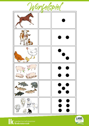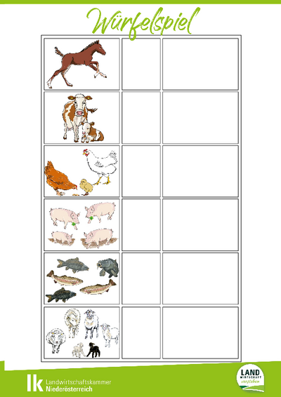 - Druck für jede:n Mitspieler:in die Vorlage einmal aus. Du siehst auf dem Papier drei Spalten. In der ersten Spalte sind Tiere abgebildet und in jeder Zeile unterschiedlich viele und verschiedene. In der dritten Spalte sind die Würfelaugen von 1 bis 6 abgebildet. Die zweite Spalte ist vorerst leer.