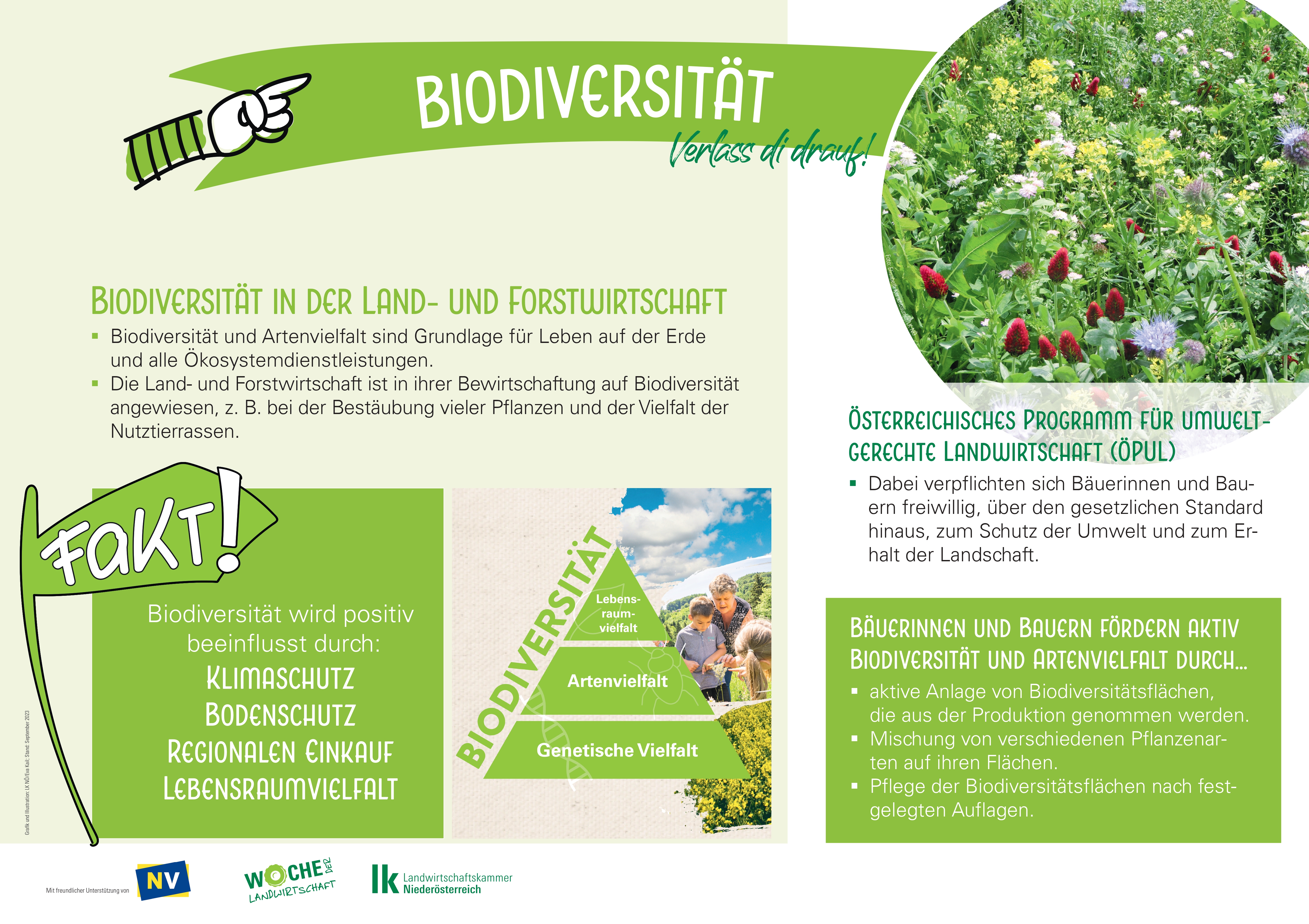 Unserer Bäuerinnen und Bauern fördern die Biodiversität durch individuelle Pflegemaßnahmen wie Lebensraumgestaltung und den Anbau verschiedener Pflanzenarten. Strukturreiche Landschaften sichern die Bestäubung, Maßnahmen wie reduzierte Bodenbearbeitung fördern die Vielfalt. Österreich hat einen hohen Stellenwert im Naturschutz, das sich durch freiwillige Umweltschutzprogramme wie ÖPUL zeigt.