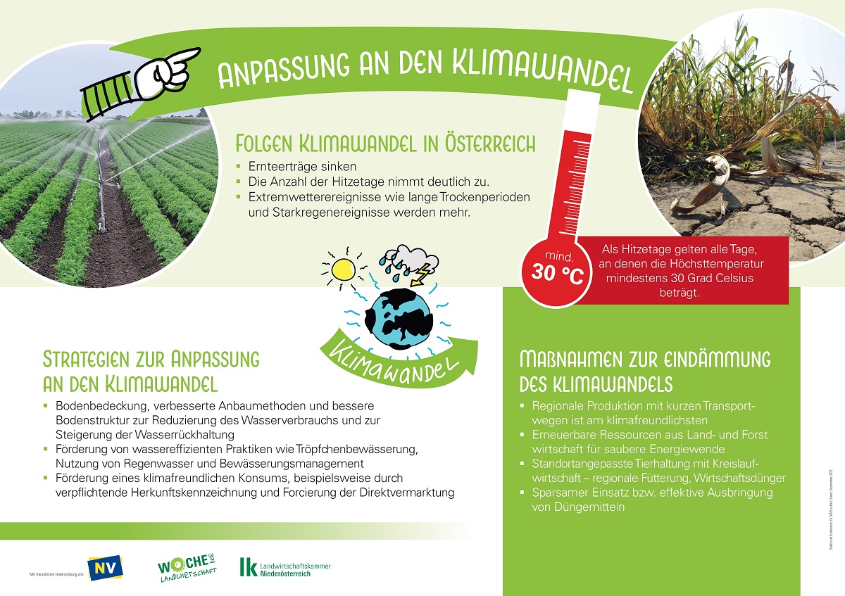 Um den Herausforderungen des Klimawandels zu begegnen, setzt der österreichische Agrar- und Forstsektor auf Anpassungs- und Nachhaltigkeitsstrategien. Dazu gehören Maßnahmen wie Wassereffizienz, Bodenschutz und -verbesserung. Die Landwirtschaftskammer unterstützt dies durch Forschungs- und Bildungsprojekte, die sich von Pflanzenbau bis Technik erstrecken, und reicht von Themen wie Knoblauchanbau bis hin zu Digitalisierung und Biodiversitätserhalt. Die Förderung eines klimafreundlichen Konsums durch Herkunftskennzeichnung und Direktvermarktung sowie die Wahl regionaler, klimafreundlicher Lebensmittel durch die Konsument:innen tragen ebenfalls zur Klimaanpassung bei. Trotz der Unmöglichkeit emissionsfreier Produktion trägt regionale Produktion erheblich zur Nachhaltigkeit bei. Dabei sind erneuerbare Ressourcen und Biomasse aus Land- und Forstwirtschaft wesentlich - Holz ist ein CO2-neutrales Baumaterial und eine wichtige Energiequelle, um die Klimaziele zu erreichen. Das Engagement Österreichs Landwirt:innen und Forstwirt:innen in diesen Bereichen macht den Sektor zu einem der klimafreundlichsten weltweit.