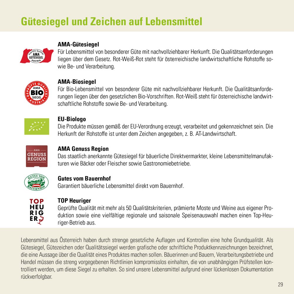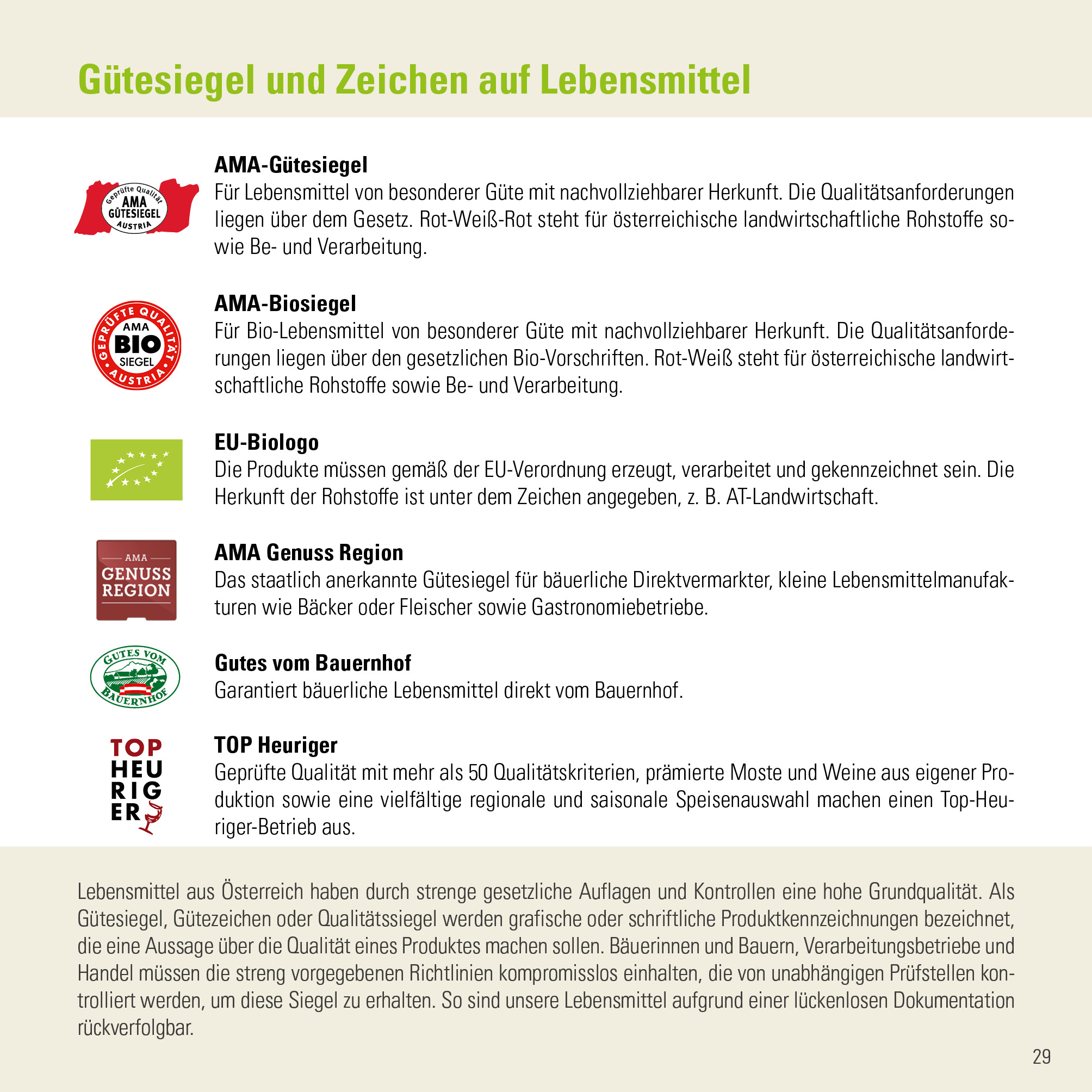 Lebensmittel aus Österreich haben durch strenge gesetzliche Auflagen und Kontrollen eine hohe Grundqualität. Als Gütesiegel, Gütezeichen oder Qualitätssiegel werden grafische oder schriftliche Produktkennzeichnungen bezeichnet, die eine Aussage über die Qualität eines Produktes machen sollen. Bäuerinnen und Bauern, Verarbeitungsbetriebe und Handel müssen die streng vorgegebenen Richtlinien kompromisslos einhalten, die von unabhängigen Prüfstellen kontrolliert werden, um diese Siegel zu erhalten. So sind unsere Lebensmittel aufgrund einer lückenlosen Dokumentation rückverfolgbar.