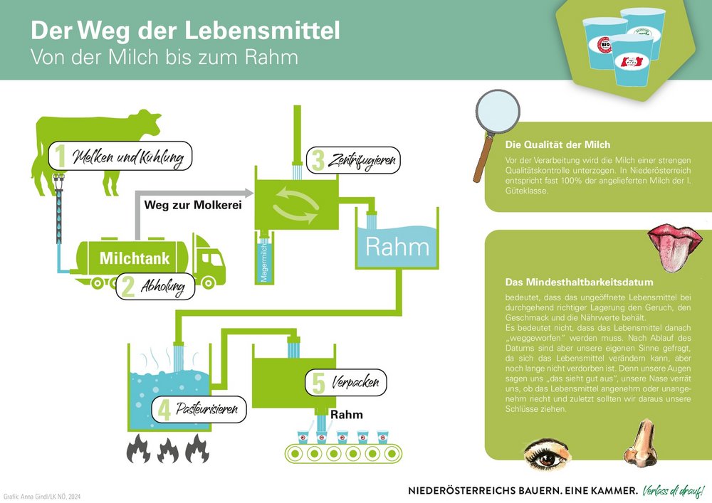 Zum Thema "Weg des Rahms" gibt's noch mehr Informationen zur Herstellung von Milch und Milchprodukten. Außerdem haben wir das dazupassende Arbeitsblatt. Schau gleich rein und schmöker durch die große Vielfalt!
