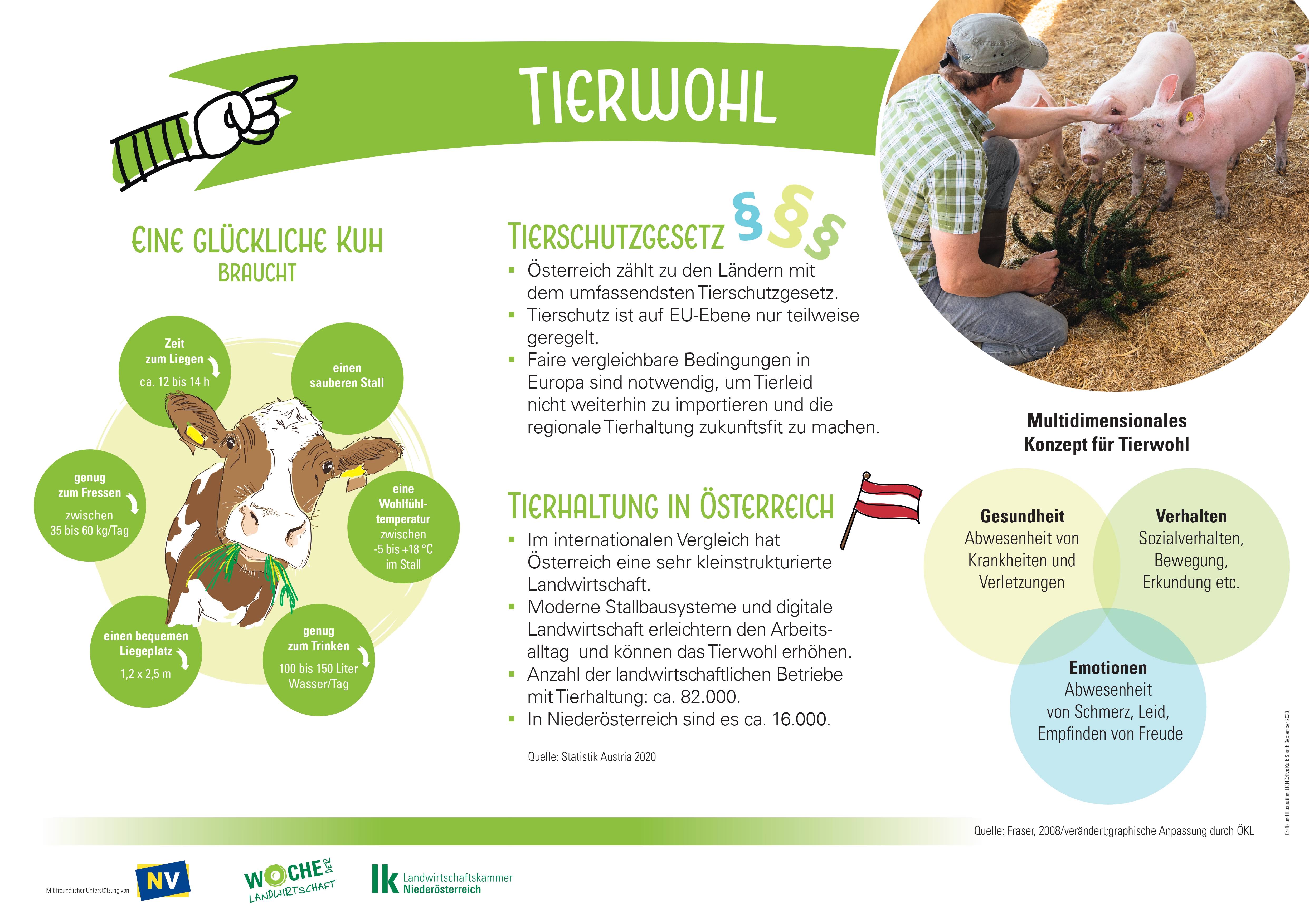 Die Standards für Produktion, Umwelt und Tierwohl sind in Österreich im Vergleich zu anderen Ländern viel höher. Es gibt eine enge Partnerschaft mit der Tierärzteschaft und regelmäßige Kontrollen. Die Mensch-Tier-Beziehung wird tagtäglich gelebt, wobei das Tierwohl bei allen Aktivitäten an oberster Stelle steht. Das Platz-1 Ranking von Österreich durch die Tierschutzorganisation World Animal Protection bestätigt dies.