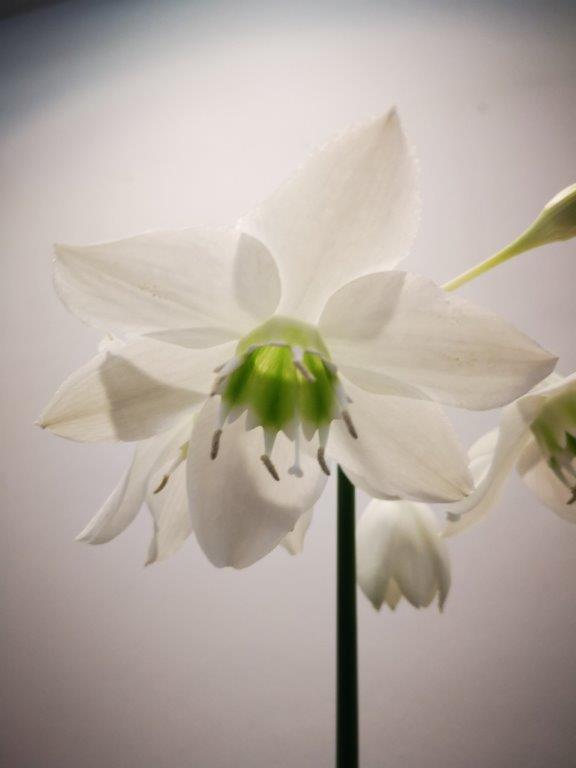 Ihre Blätter sind bis zu 40 cm lang, glänzend grün, länglich und spitz zulaufend. Die Blüten werden oft als narzissenähnlich beschrieben. Pro Blütenstiel können drei bis sieben Blüten sitzen. Die reinweiße Blüte kann auch angenehm duften. Hauptblütezeit ist von Dezember bis März, was aber nicht heißt, dass sie nicht in anderen Monaten auch blüht.
