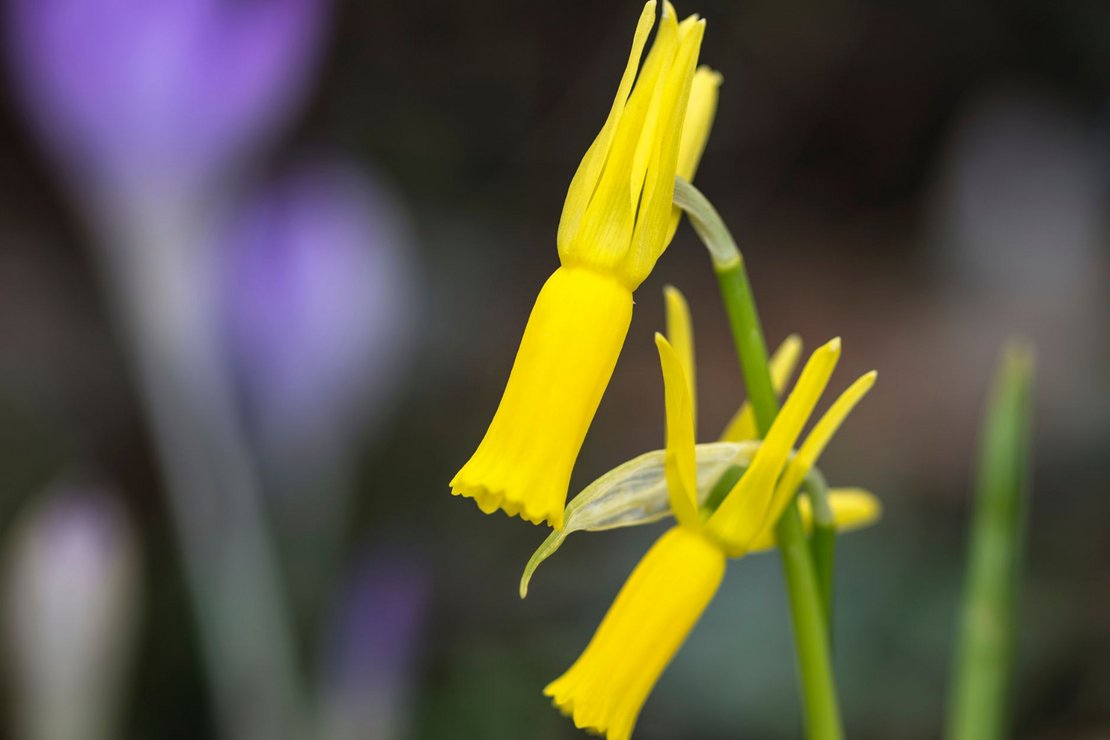 Blüten der cyclamenblütigen Narzisse (Narcissus cyclamineus) zeichnen sich durch ihre stark zurückgeschlagenen Blütenblätter des Kranzes aus. Die Hauptsorte dieser Gruppe ist „Tête-à-Tête“, welche jetzt gerade bei ihrem Gärtner erhältlich ist. Sie wird nur 30 Zentimeter hoch und treibt mehrere hellgelbe Blüten pro Stiel.