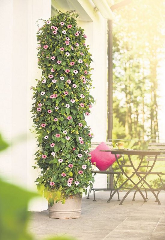 Susy Rose ist eine Schwarzäugige Susanne (Thunbergia alata), die mit einer besonderen Blütenfarbe auf sich aufmerksam macht. Die Schwarzäugige Susanne kennt man mit gelben, weißen oder orangen Blüten, Susy Rose aber kann mit pinken Blüten aufwarten. Das schwarze Blütenauge, das der Pflanze ihren Namen gibt, ist auch bei Susy Rose vorhanden und passt harmonisch zu der ausgefallenen Blütenfarbe.