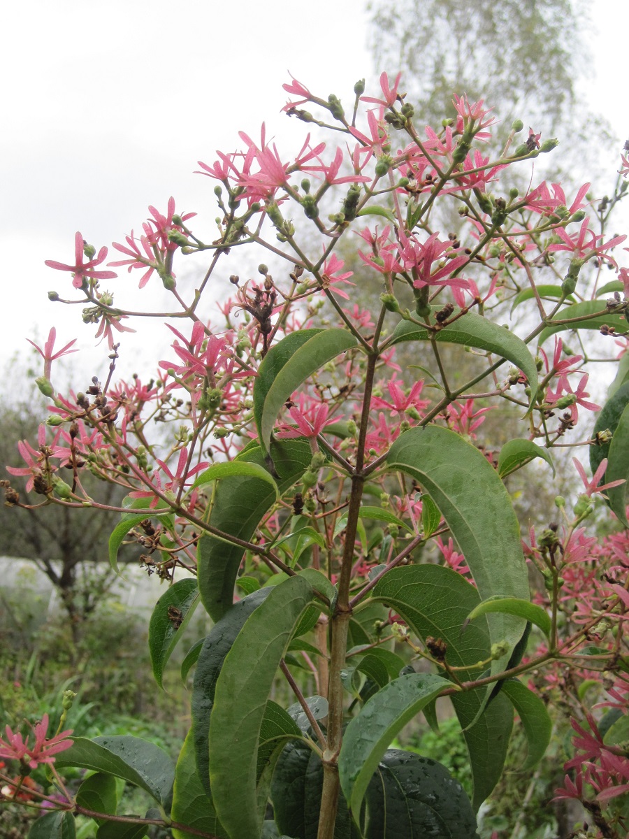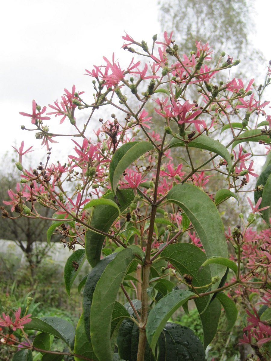 Der Strauch aus Zentralchina besticht durch sein längliches zur Spitze etwas herabgebogenes Laub. Auch seine Blüten und seine Fruchtstände ziehen die Blicke auf sich. Er blüht erst zwischen August und Oktober, wo im Garten sonst fast keine Gehölze blühen. Seine weißen duftenden Blüten stehen in Rispen zusammen. Aus den Blüten bilden sich rote bis purpurfarbene Fruchtstände, die mit ihren Kronblättern selbst wie Blüten aussehen. Die Blätter verliert er erst sehr spät, manchmal erst im Winter.