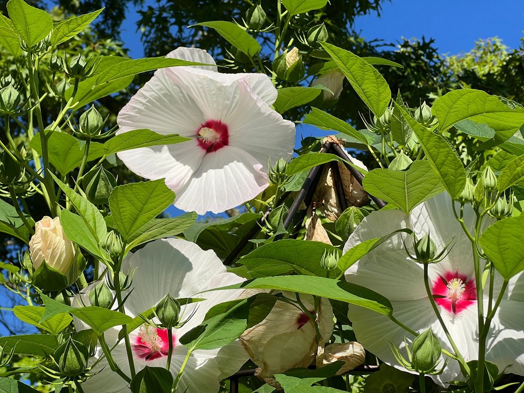 Der Sumpfeibisch (Hibiscus moscheutos) stammt aus den südöstlichen USA. Im Garten ist er einzeln oder in Gruppen ein wahrer Blickfang.