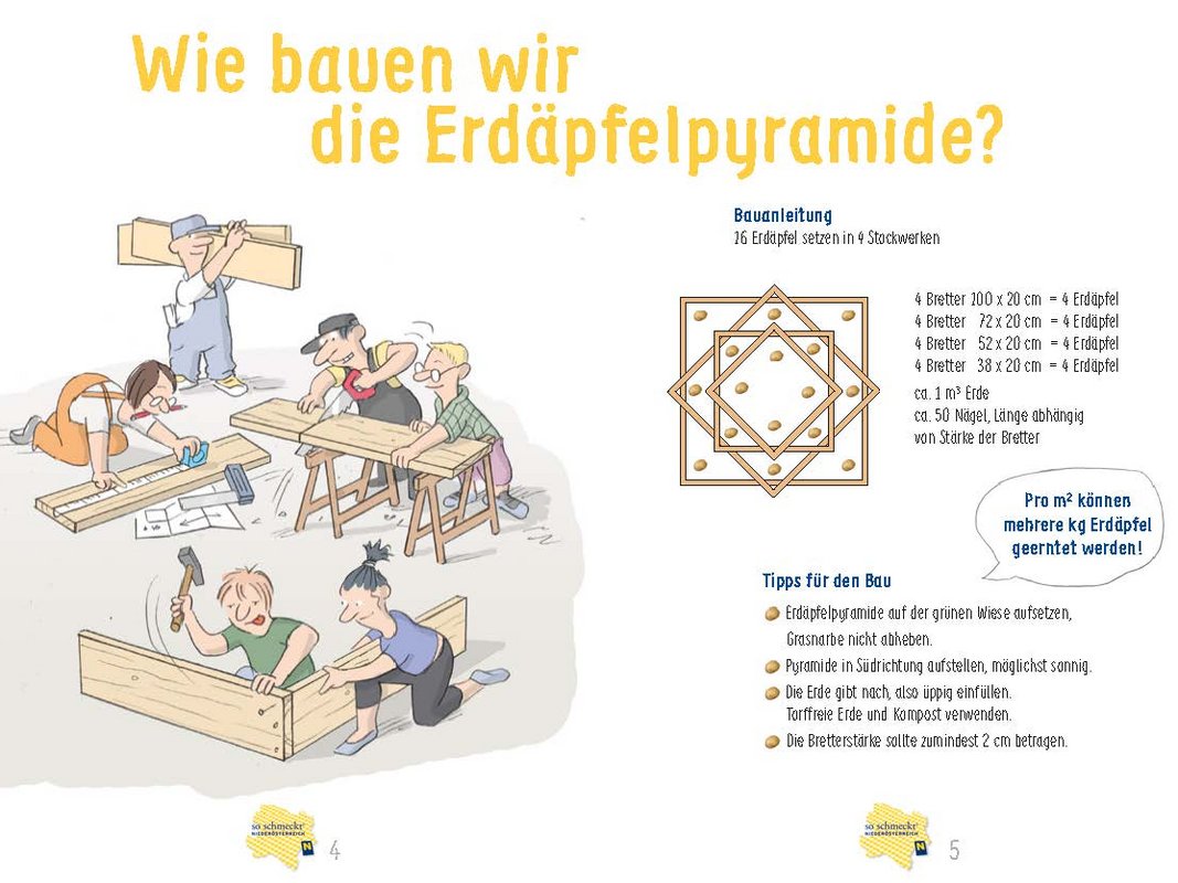 - 1 Broschüre mit Bauanleitung, Rezepten und Infos rund um die Erdäpfel- bzw. Gemüsepyramide
