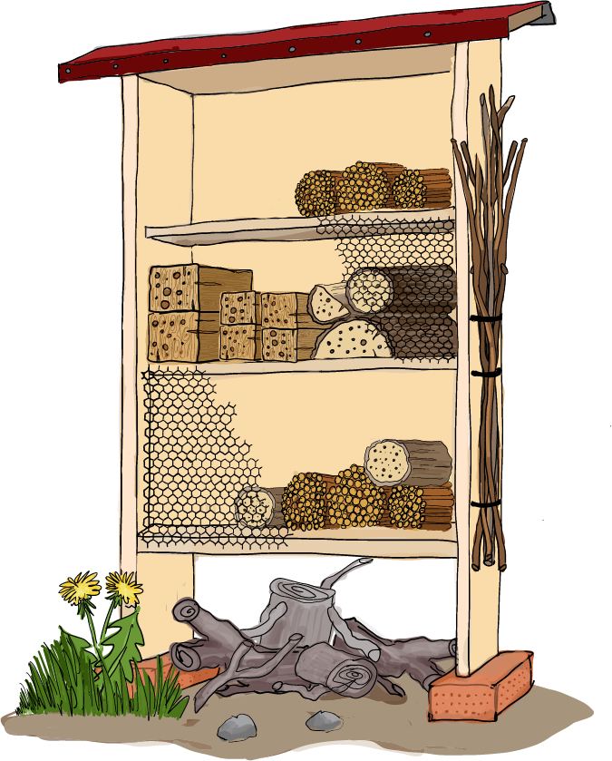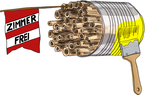 Das Innere eines Insektenhotels sollte so abwechslungsreich wie möglich gestaltet werden, um den Ansprüchen der einzelnen Arten gerecht zu werden. Sammle hohe Pflanzenstängel, Bambusröhrchen, Stroh, Rundhölzer (angebohrt), kleine Ästchen, Zapfen, Holzwolle, Reste von Hasengittern oder diverse Holzreste. Damit schaffst du für Insekten ein optimales Zuhause.