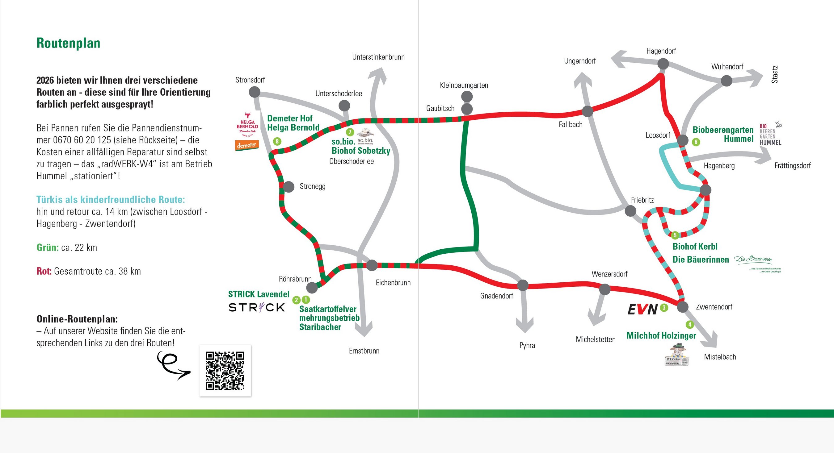 Die lange Radroute verbindet verschiedene Stationen im Land um Laa. Die kindgerechte Route führt zu drei Betrieben, die gemütliche Route erlaubt ausgiebiges Genießen bei vier Betrieben. Alle Routen sind mittels QR Code und gut ausgesprayten Hinweispfeilen und Schildern leicht zu "erfahren". Du findest sie nicht nur online, sie sind auch in der Broschüre Radwandertag 2026 enthalten.