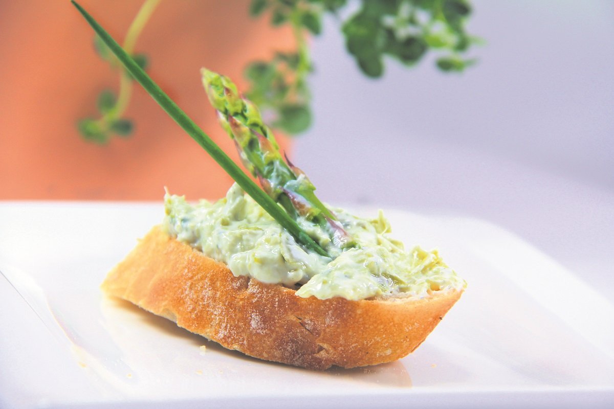 Die Aufstrichbrötchen je nach Belieben mit Spargelspitzen, Eierscheiben, Rohschinkenstreifen, Kräutern oder essbaren Blüten schön garnieren.