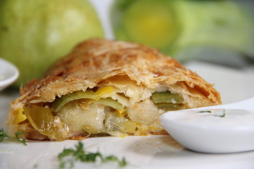 Den Blätterteig auf ein Backpapier legen, ein Drittel der Fläche mit der Porree-Birnen-Käse-Masse belegen. Den Blätterteig einrollen und mit einem verquirlten Dotter bestreichen. Den Strudel im vorgeheizten Rohr ca. fünf Minuten bei 220 °C, dann weitere 15 Minuten bei 180 °C goldbraun backen.