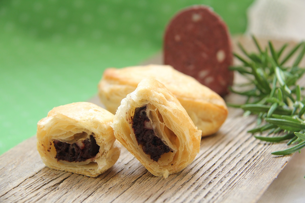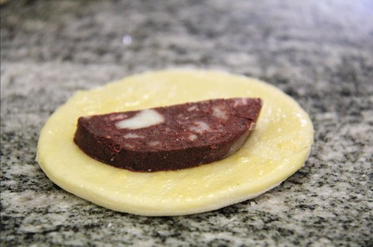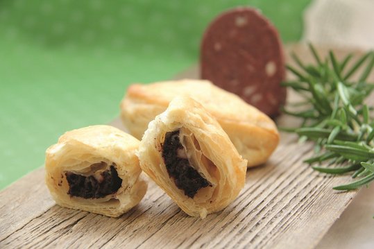 Für die Fülle die Blutwurst in nicht zu dicke Scheiben schneiden und halbieren. Den Blätterteig auf einer bemehlten Fläche zu einem etwa 28 x 32 cm großen Rechteck auswalken, Kreise ausstechen und mit der halbierten Blutwurst Scheibe belegen.