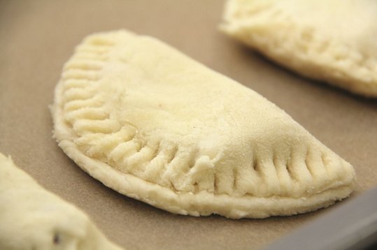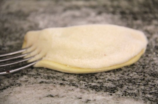 Den Blätterteig darüberstülpen und mit der Gabel fest andrücken. Auf ein mit Backtrennpapier belegtes Backblech legen und im vorgeheizten Rohr bei 220 °C einige Minuten anbacken, Hitze reduzieren und etwa 15 Minuten fertig backen.
