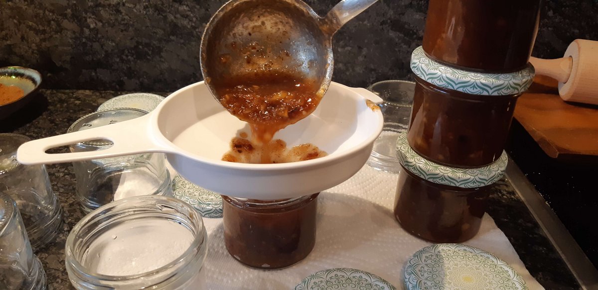 Mit einem Pürierstab kurz mixen, dann kann die Marmelade ganz fein genossen werden.