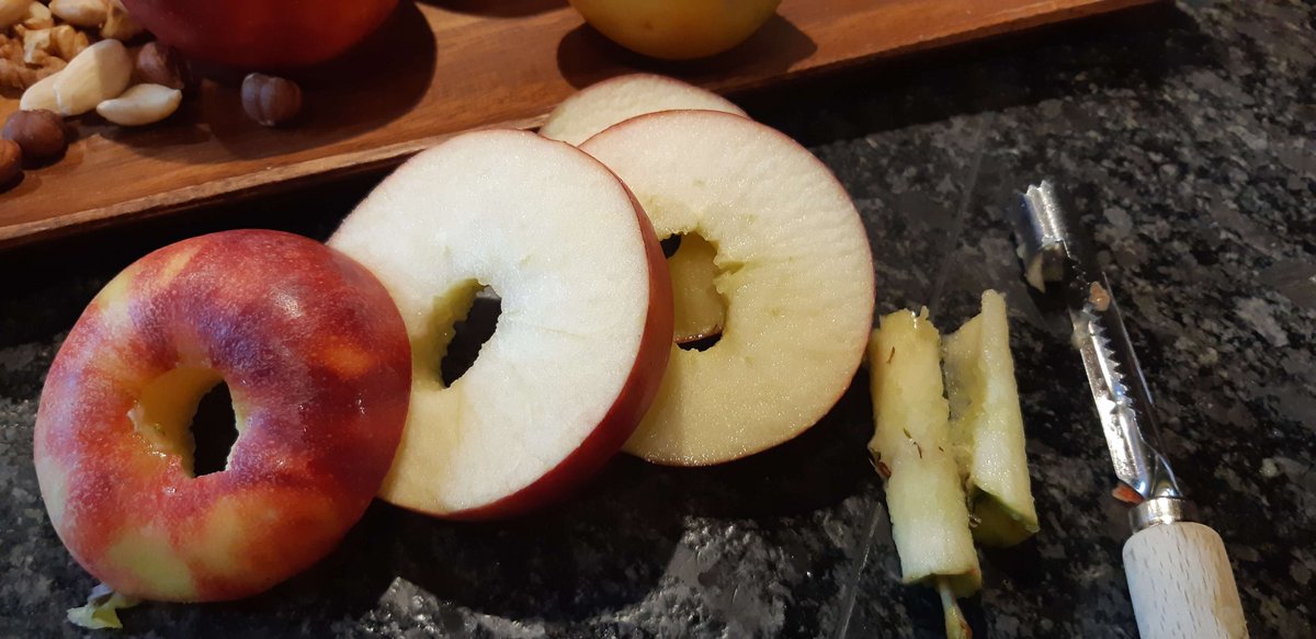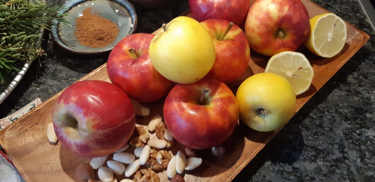 Äpfel entkernen, fein würfelig schneiden und mit Zitronensaft beträufeln. Nüsse fein hacken, mit den Äpfeln vermischen und auf einem Blech verteilen. Im Backrohr bei 170 Grad ca. 30 Minuten im Backrohr braten lassen.