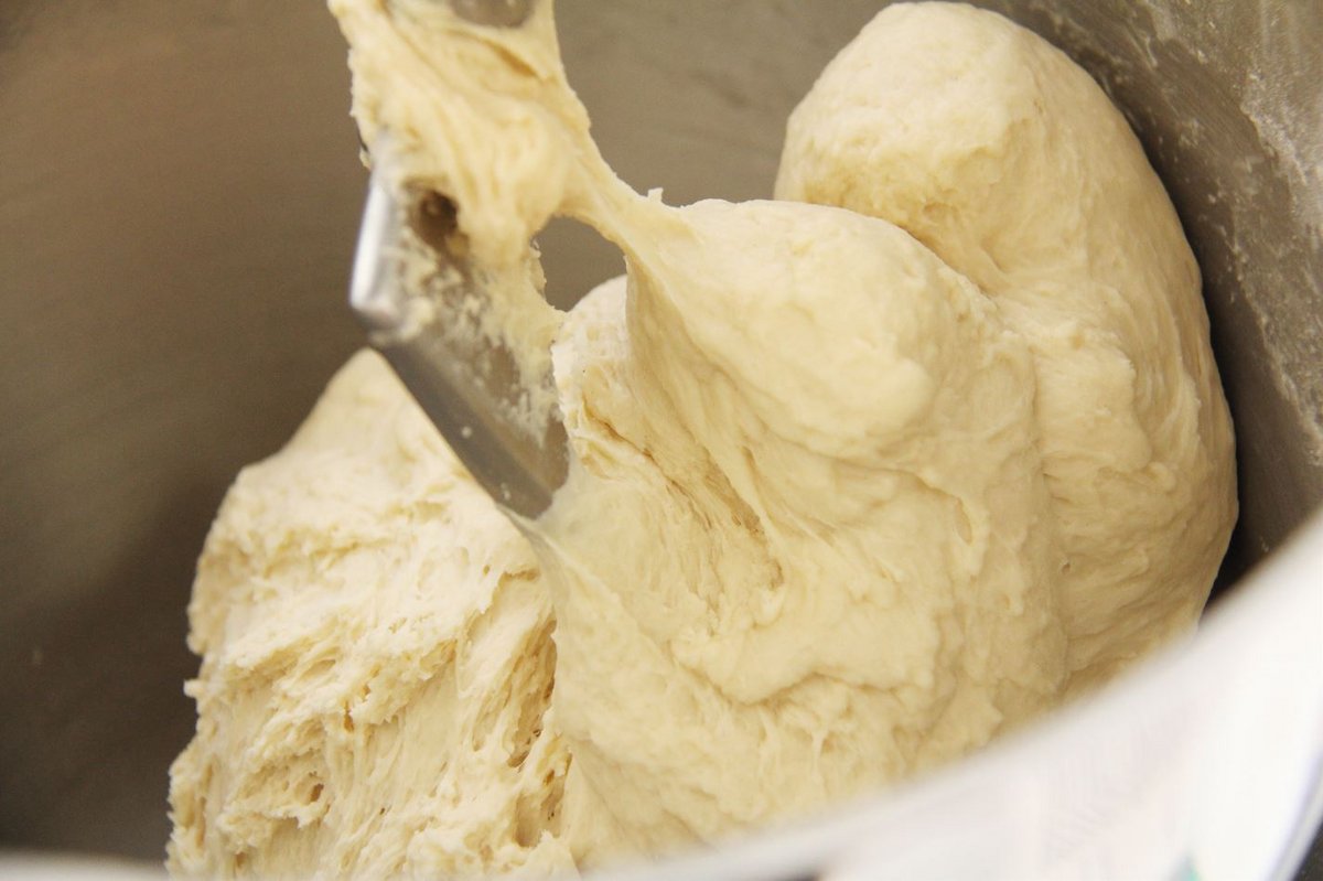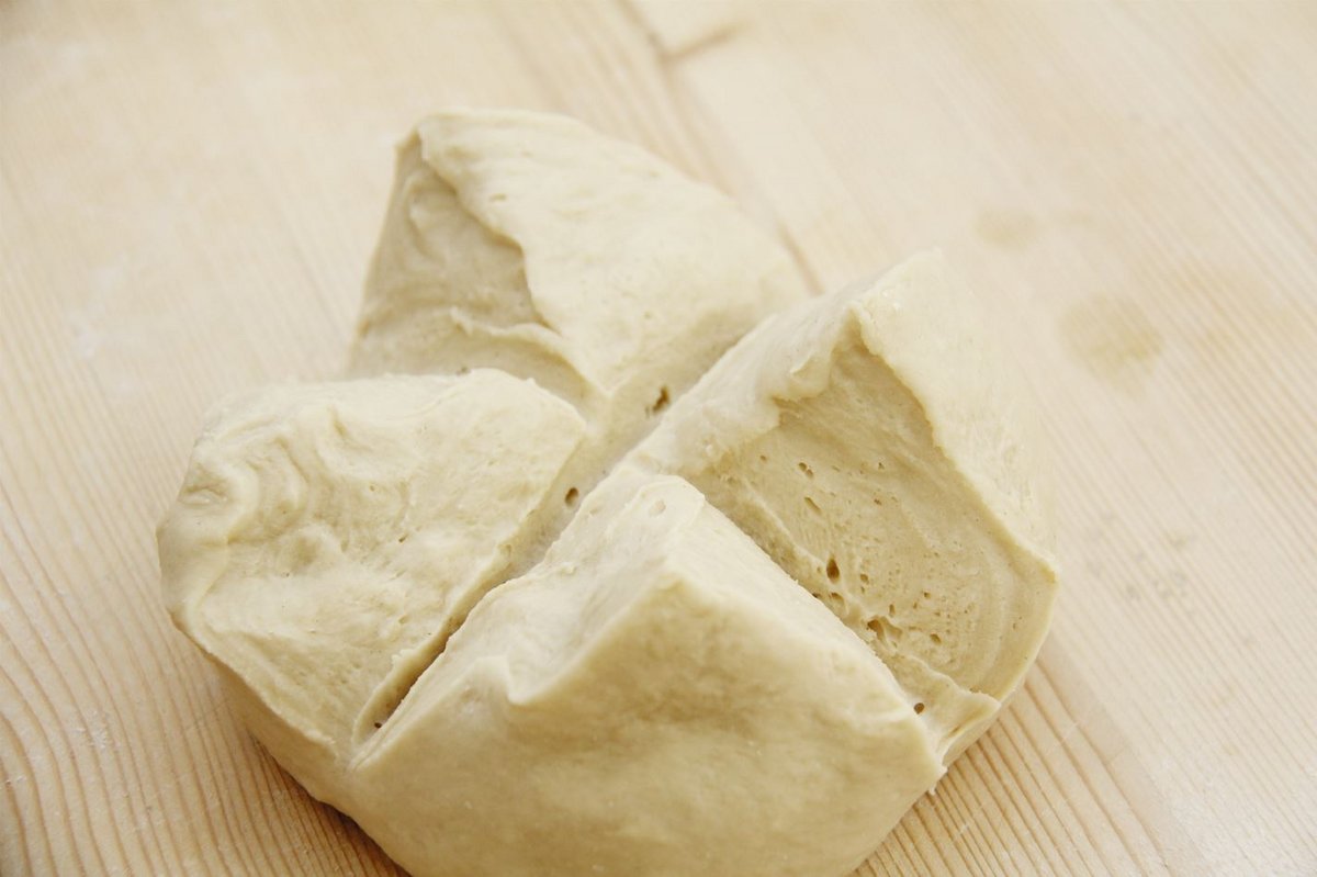 Alle Zutaten in der Rührteigschüssel mit der Küchenmaschine mit dem Knethacken maximal 7 Minuten zu einem glatten Teig verkneten lassen. Den Teig zu einer Kugel formen, mit Folie abdecken und zehn Minuten kalt rasten lassen.