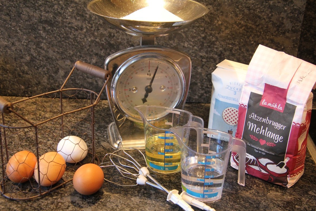 4 Eier trennen und die Dotter mit 200 g Zucker schaumig schlagen und langsam 1/8l Wasser und 1/8 l Öl (Sonnenblumenöl) einrühren. 250 g Weizenmehl unter die Masse heben. 4 Eiklar schaumig schlagen und den Eischnee mit einem Schneebesen unterheben.