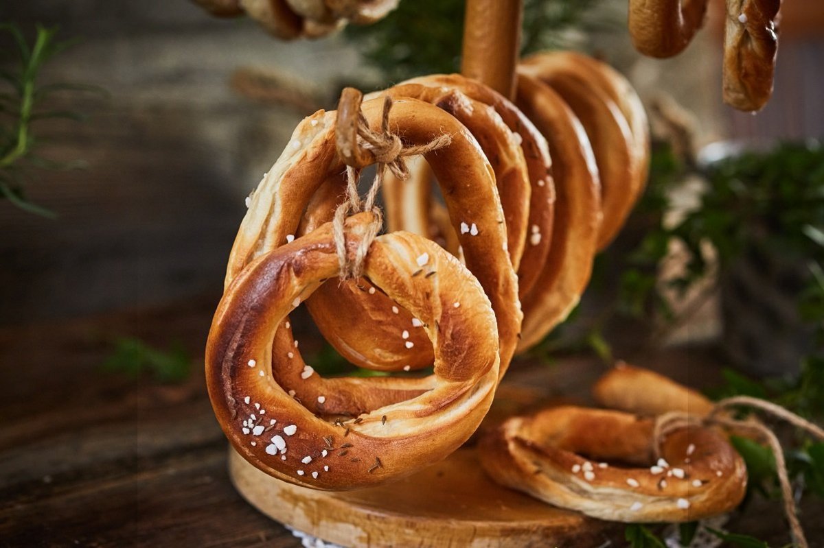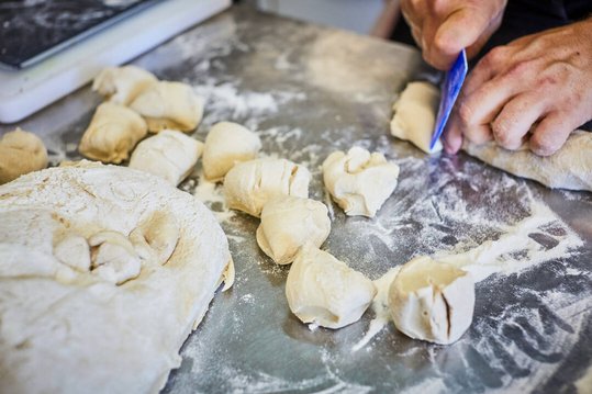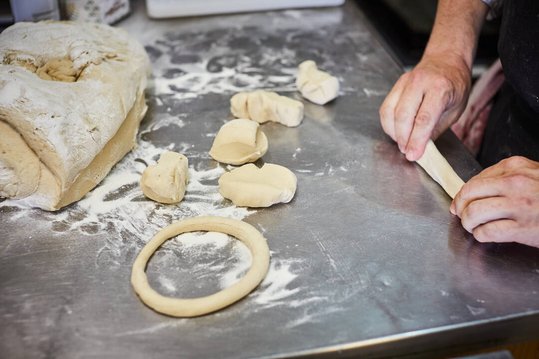Den Teig auf einer bemehlten Arbeitsfläche nochmals kurz kneten, in 50 Gramm schwere Teigstücke auswiegen. Jedes Teigstück zu einem Strang wälzen und einem Beugel formen.
