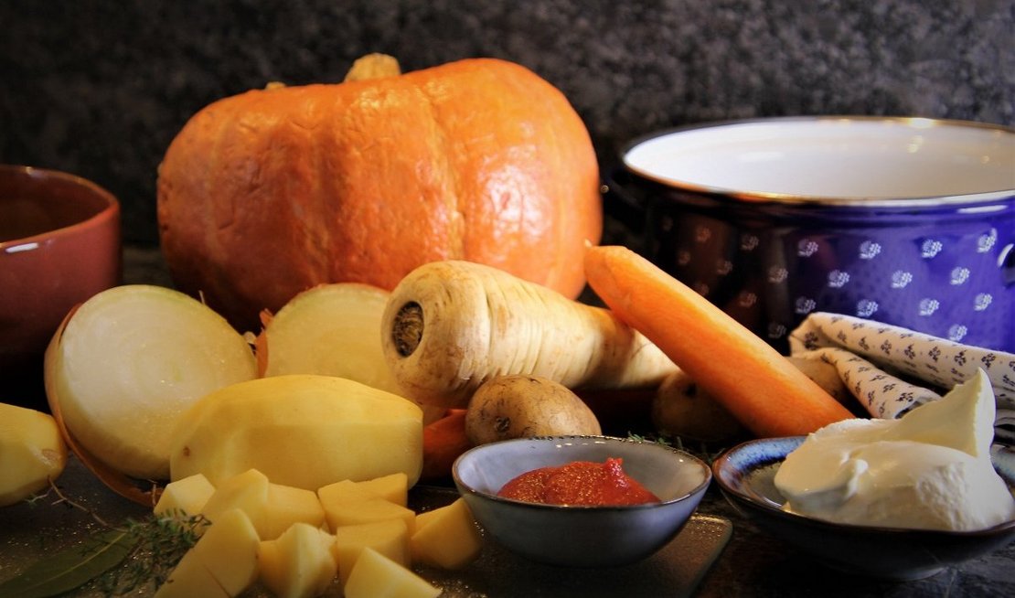 • Je nach Saison kann anstelle von Kürbis auch gelber und roter Paprika für das Gulasch verwendet werden. Auch die Kräuter können nach Saison gewechselt werden. Im Frühling mit Bärlauch verfeinern.