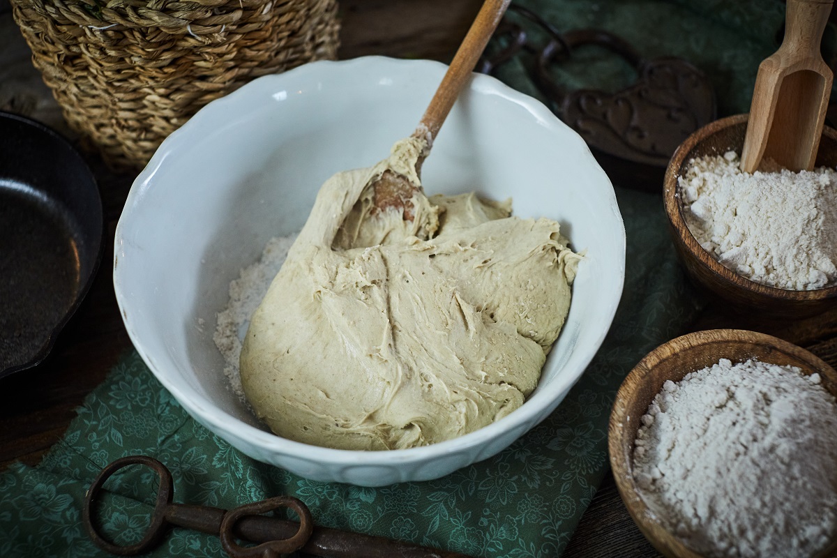 Für den Teig Wasser, Trockengerm, Salz, Zucker, Kümmel, Butterschmalz oder Öl mit dem Schneebesen gut verrühren. Dann das Mehl mit einem Kochlöffel gut in die Flüssigkeit einarbeiten. Den Teig zugedeckt ca. eine Stunde an einem warmen Platz gehen lassen.