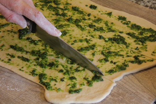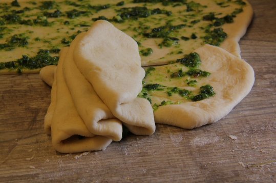 Den Teig vorsichtig mit beiden Handflächen flach drücken und zu einer Kugel formen. Danach den Teig auf einer bemehlten Arbeitsfläche zu einem Rechteck ausrollen (ca. 45 x 45 cm). Den Teig mit Bärlauchpesto bestreichen. Das Rechteck in ca. 2 - 3 cm breite Streifen schneiden.