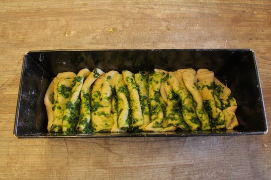 Jeden Teigstreifen zu einem „W“ falten und aufrecht nacheinander in eine mit Backtrennpapier ausgelegte Kastenform stellen. Die übrigen Teigstreifen ebenso falten und hintereinander in die Form setzen.