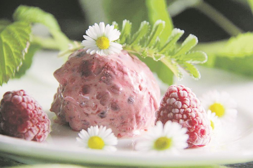 Gelatine in kaltem Wasser einweichen. Himbeeren passieren (falls tiefgekühlt, vorher auftauen). Eiweiß mit Zucker zu cremigem Schnee schlagen. Zitronensaft erwärmen, gut ausgepresste Gelatine darin schmelzen und unter die Himbeeren rühren. Himbeermasse unter den Schnee mischen. Obers schlagen und in die Himbeermasse einrühren. In einer mit Frischhaltefolie ausgelegten Kastenform tiefkühlen.
