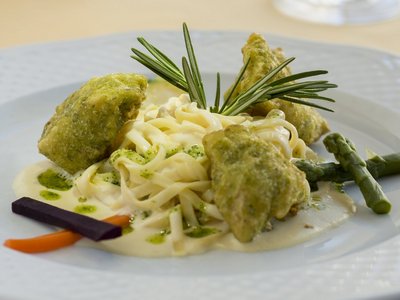Die Karpfenfiletstreifen zusammen mit den Erdäpfelspalten anrichten und mit Zitrone garnieren. Bandnudeln mit Schlagobers, Salz, Pfeffer und Muskatnuss zur sämigen Sauce einkochen.