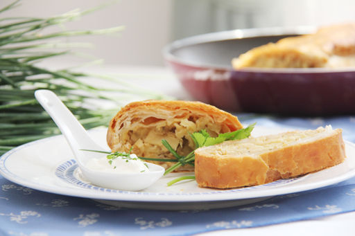 Strudelteig auf einem gut bemehlten Strudeltuch ausrollen, ein vier Zentimeter breites Stück abschneiden und beiseite geben. Den restlichen Teil mit zerlassenem Fett bepinseln. Nun die leicht ausgekühlte Krautmasse darauf verteilen, kräftig mit frischem Pfeffer würzen und einrollen. Den Krautstrudel in eine beschichtete, befettete Pfanne geben. Aus dem Teigstreifen beliebige Formen ausstechen, den Strudel mit Ei bepinseln und mit den Formen dekorativ belegen. Im Backrohr auf mittlerer Schiene bei 200 °C knusprig braun backen.