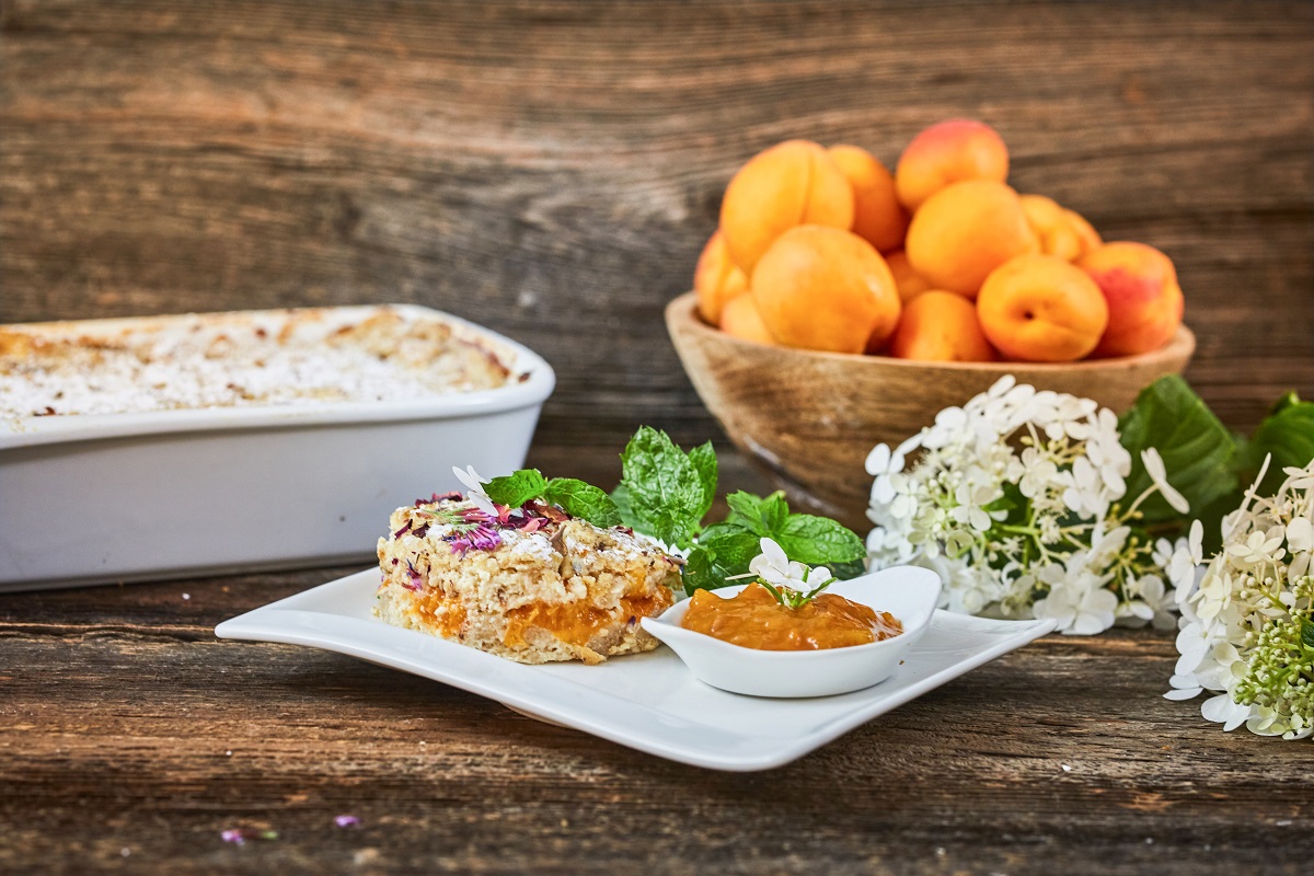 Die halbe Topfenmasse in die Auflaufform geben und die Marillenstücke darauf verteilen. Die restliche Topfenmasse auf den Marillenstücken verteilen und glatt streichen. Einige Butterflocken darauf verteilen und im vorgeheizten Backrohr bei 180 °C ca. 50 Minuten backen. In den ersten 30 Minuten den Auflauf abdecken, damit er nicht zu dunkel wird. Mit Staubzucker bestreut und etwas Marillenröster servieren.
