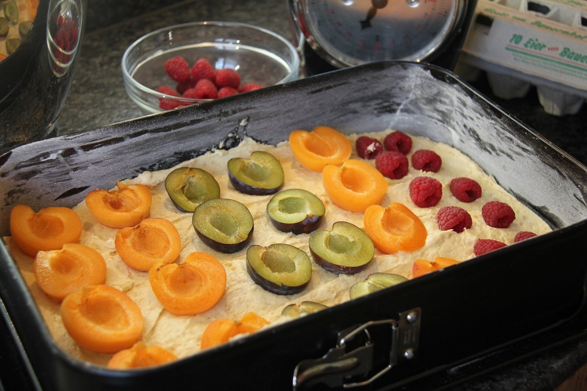 Den Teig in eine befettete und bemehlte oder mit Backtrennpapier belegte Kuchenform streichen und mit den vorbereiteten Früchten belegen.