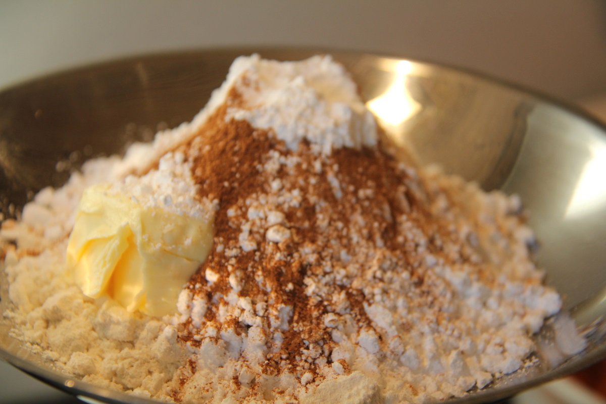 Für den Streusel Mehl und Butter zwischen den Händen verbröseln und Zucker und Zimt darunter mischen.