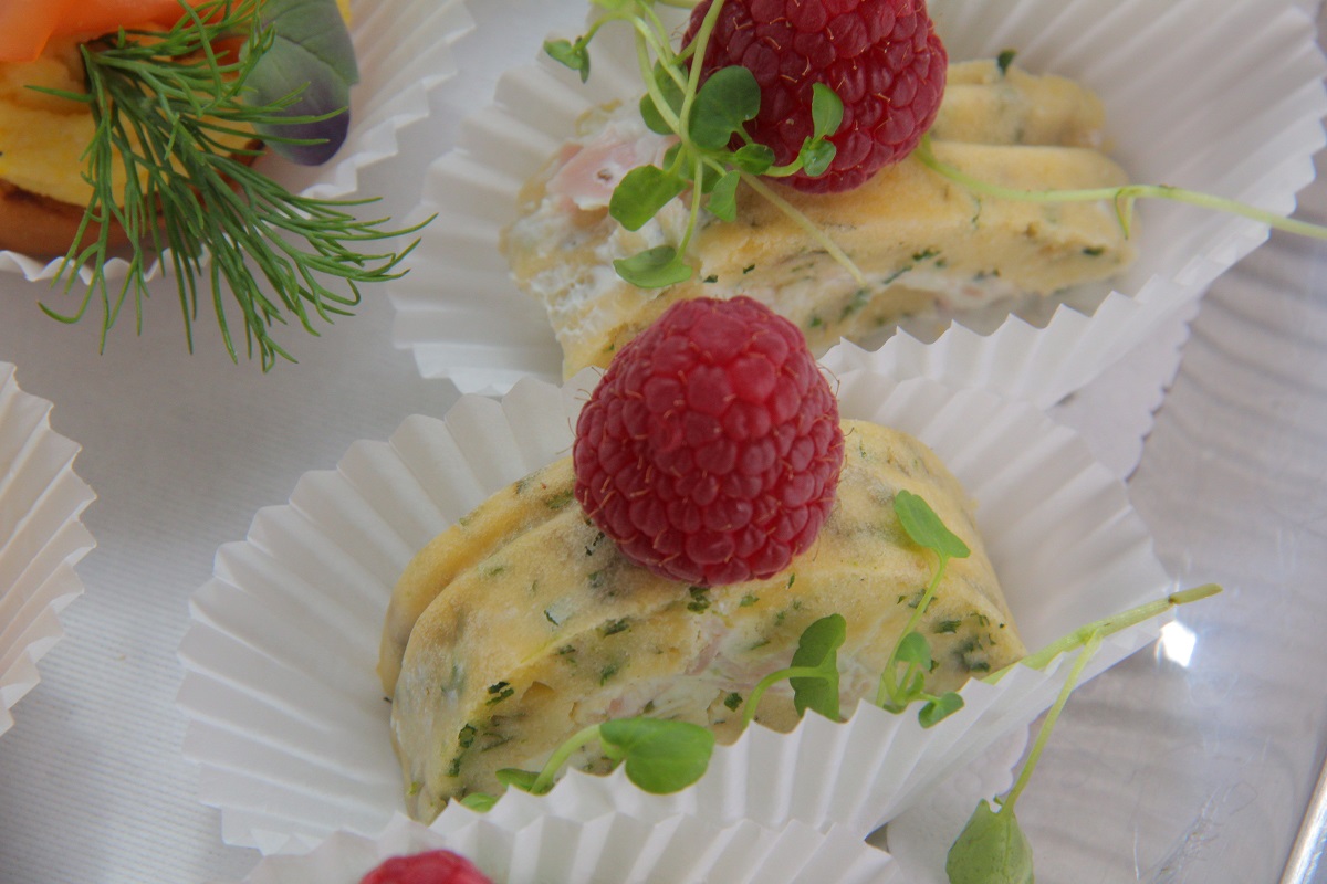Für die Fülle den Schinken und die Essiggurkerl fein würfelig schneiden und mit allen Zutaten gut verrühren und pikant würzen. Erkaltetes Biskuit vorsichtig aufrollen, mit der Hälfte der Schinkenfülle bestreichen, Schinkenblätter darauf legen, restliche Fülle darauf verstreichen und eng einrollen. In Backtrennpapier gewickelt im Kühlschrank einige Stunden ziehen lassen. Roulade auswickeln und mit einem scharfen Messer in 2 cm dicke Scheiben schneiden.