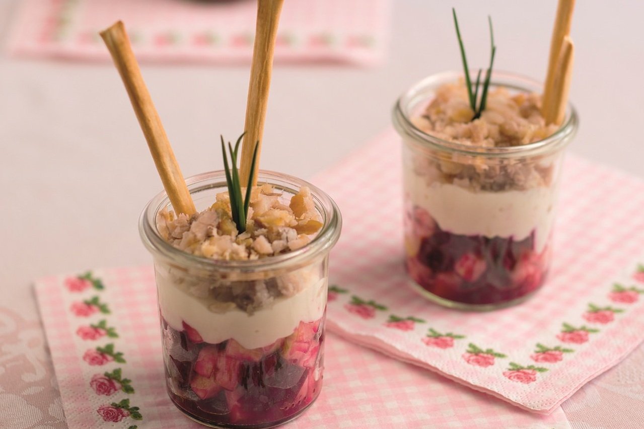 Rote Rüben und den Apfel kleinwürfelig schneiden und mit Zitronensaft und Olivenöl vermischen. Mit Salz und Pfeffer würzen und auf die Gläser aufteilen.