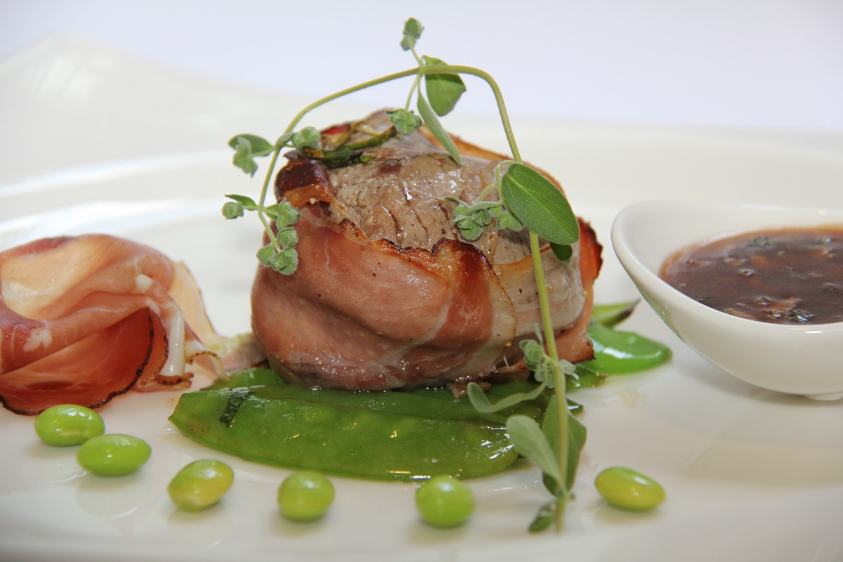 Im Bratenrückstand Zucker karamellisieren, fein gehackte Zwiebel, würfelig geschnittenen Speck und fein gehackte Knoblauchzehen anrösten, mit Malzbier ablöschen, mit braunem Fond aufkochen und etwas einreduzieren. Erbsenschoten putzen und in Wasser acht Minuten kochen, dann abseihen, in zerlassener Butter schwenken, abschmecken, mit der Soße und den Filets servieren.