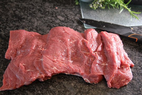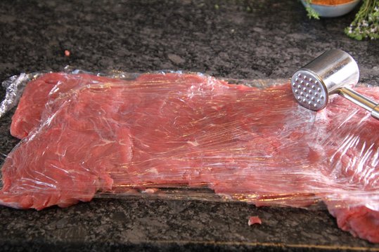 Rindfleisch mit einem Schmetterlingsschnitt großflächig aufschneiden. Zwischen der Frischhaltefolie gut flach klopfen und mit Salz und etwas Grillgewürz würzen.