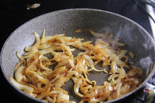 Zwiebel schälen, in dünne Streifen schneiden und in heißem Butterschmalz mit etwas Zucker goldbraun anrösten und abkühlen lassen. Den Senf einrühren und auf den Speckscheiben verteilen.