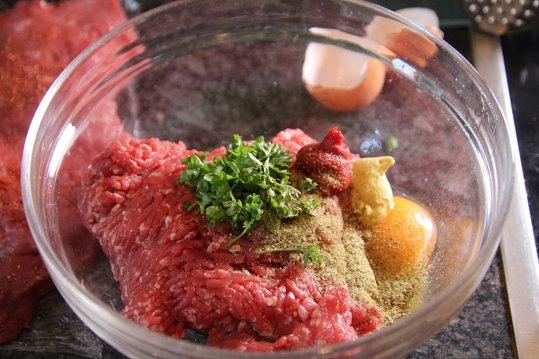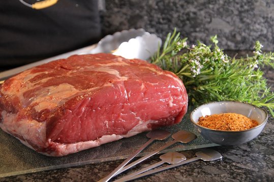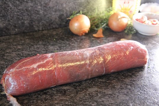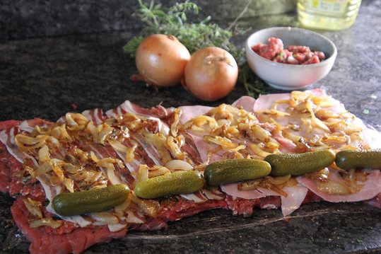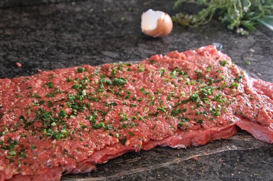Das Faschierte mit der BBQ-Soße, fein gehackten Knoblauch und gehackten Kräuter und Petersilie, Ei, Salz und Pfeffer vermengen. Das Faschierte auf dem Rindfleisch dünn aufstreichen und die Speckstreifen oder den Schinken darauf legen.