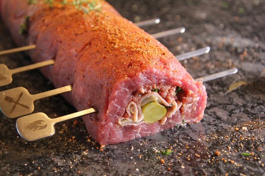 Essiggurken auf den unteren Rand legen und das Fleisch mit der Füllung mithilfe der Frischhaltefolie zu einer Roulade straff einrollen. Die Fleischroulade mindestens eine Stunde, besser noch über Nacht, in den Kühlschrank legen. Die Holzspieße in Wasser einlegen, damit sie beim Grillen nicht anbrennen.