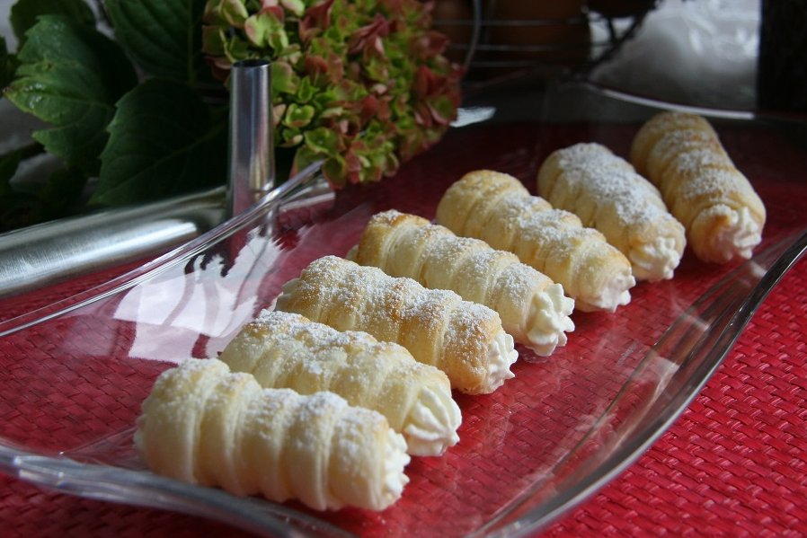 Blätterteig in 30 cm lange Streifen schneiden und diese gleichmäßig von der dünneren Seite aus beginnend auf die Schaumrollenformen wickeln und im vorgeheizten Backrohr ca. 15 bis 20 Minuten bei 200 °C backen. Vorsichtig von den Formen nehmen und auskühlen lassen.