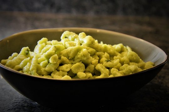 Salzwasser zum Kochen bringen und die Spätzle mit einem Spätzlehobel oder Spätzlesieb einkochen. Kurz aufkochen lassen, bis die Spätzle an der Oberfläche schwimmen, abseihen und anschließend kalt abschrecken.
