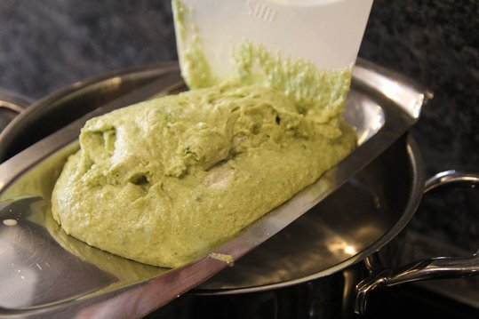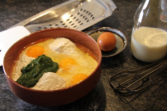 Spinat- oder Bärlauchpüree mit den Eiern in einem hohen Becher mit dem Mixstab fein pürieren. Mit dem Mehl und den restlichen Zutaten mit dem Mixer zu einem glatten Teig verarbeiten.