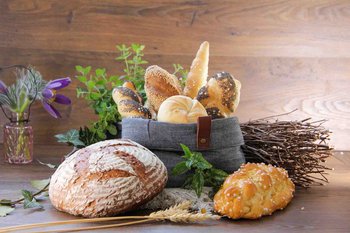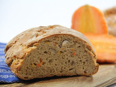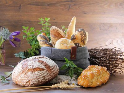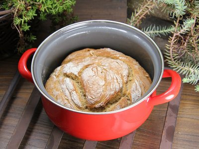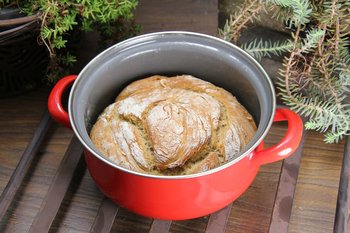 Mit Dampf bei 240 °C Ober- und Unterhitze in das vorgeheizte Backrohr auf das Gitter stellen und die Temperatur auf 200 °C reduzieren. Etwa 50 Minuten backen. In den letzten 10 Minuten den Dampf ablassen, damit eine Kruste entsteht. Die Kerntemperatur sollte nach dem Backen mindestens 95 °C aufweisen, dann ist das Brot durchgebacken.