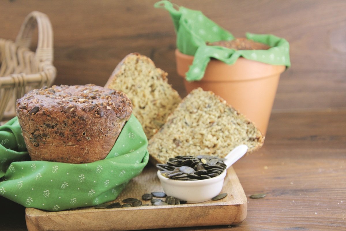 Brühstück: Die Kürbiskerne in der Pfanne anrösten oder im Backrohr ca.10 Minuten bei 160 °C Heißluft rösten und abkühlen lassen. Ganze Kürbiskerne mit dem Dinkelvollkornmehl in eine Schüssel geben und vermischen. Das Wasser aufkochen, zu den anderen Zutaten leeren und mit einem Kochlöffel rasch unterrühren. Das fertige Brühstück überkühlen lassen, abdecken und bei Raumtemperatur 12 Stunden stehen lassen.