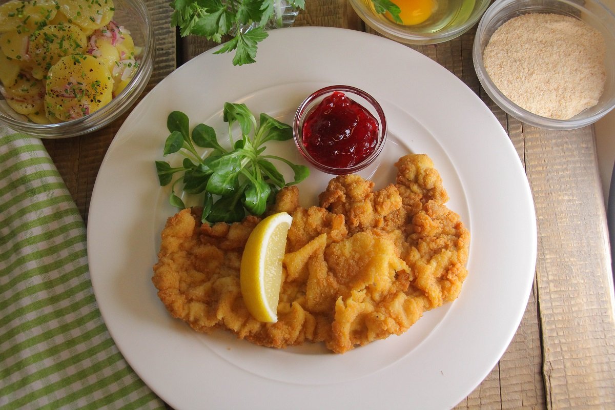 Das Fett in einer tiefen Pfanne auf ca. 170 °C erhitzen und die Schnitzel auf beiden Seiten schwimmend goldbraun herausbacken. Die Pfanne dabei leicht schwenken.